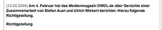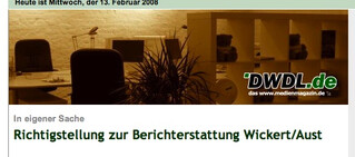 heute hat das spitzen-medien-magazin dwdl etwas richtiggestellt, „In eigener Sache“. und zwar eine „Richtigstellung zur Berichterstattung Wickert/Aust“. die berichterstattung „Wickert/Aust“ fand sich bis vor ein paar tagen hier. jetzt ist sie offenbar gelöscht, auch wenn einige dwdl-artikel die „Berichterstattung Wickert/Aust“ noch wie folgt anteasern: „Machen Aust und Wickert »Spiegel TV« Konkurrenz?“ machen sie natürlich nicht, das hat dwld bereits am 04.02.2008 „widerrufen“. herr aust hat das auch gleichzeitig mit dem widerruf gegendargestellt.