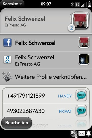 achso, bevor ichs vergesse, auch die sonstige bedienung des pre-adressbuchs ist äusserst angenehm. shortcuts und kurzwahlen kann man einfach angelegen, einzelne einträge lassen sich systemweit einfach über die anfangsbuchstaben des namen finden, einzelne klingeltöne lassen sich direkt im adressbuch zuweisen, ebenso notizen die man beim nächsten anruf der person anzeigen lassen kann.