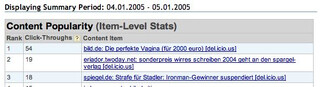 meinen rss-feed, zumindest den grossteil, habe ich ja bekanntlich (wie moe) zu feedburner ausgelagert. das spart traffic und zaubert einen premium-feed zusammen. und eine überraschende statistik. so gibt es ca. 200-280 tägliche leser („circulation“). gestern gabs auch einen clickthrough-rekord. dieser eintrag aus dem linkdump „bild.de: Die perfekte Vagina (für 2000 euro) [del.icio.us]“ hat innerhalb von weniger als 24 stunden 55 clickthroughs bekommen.