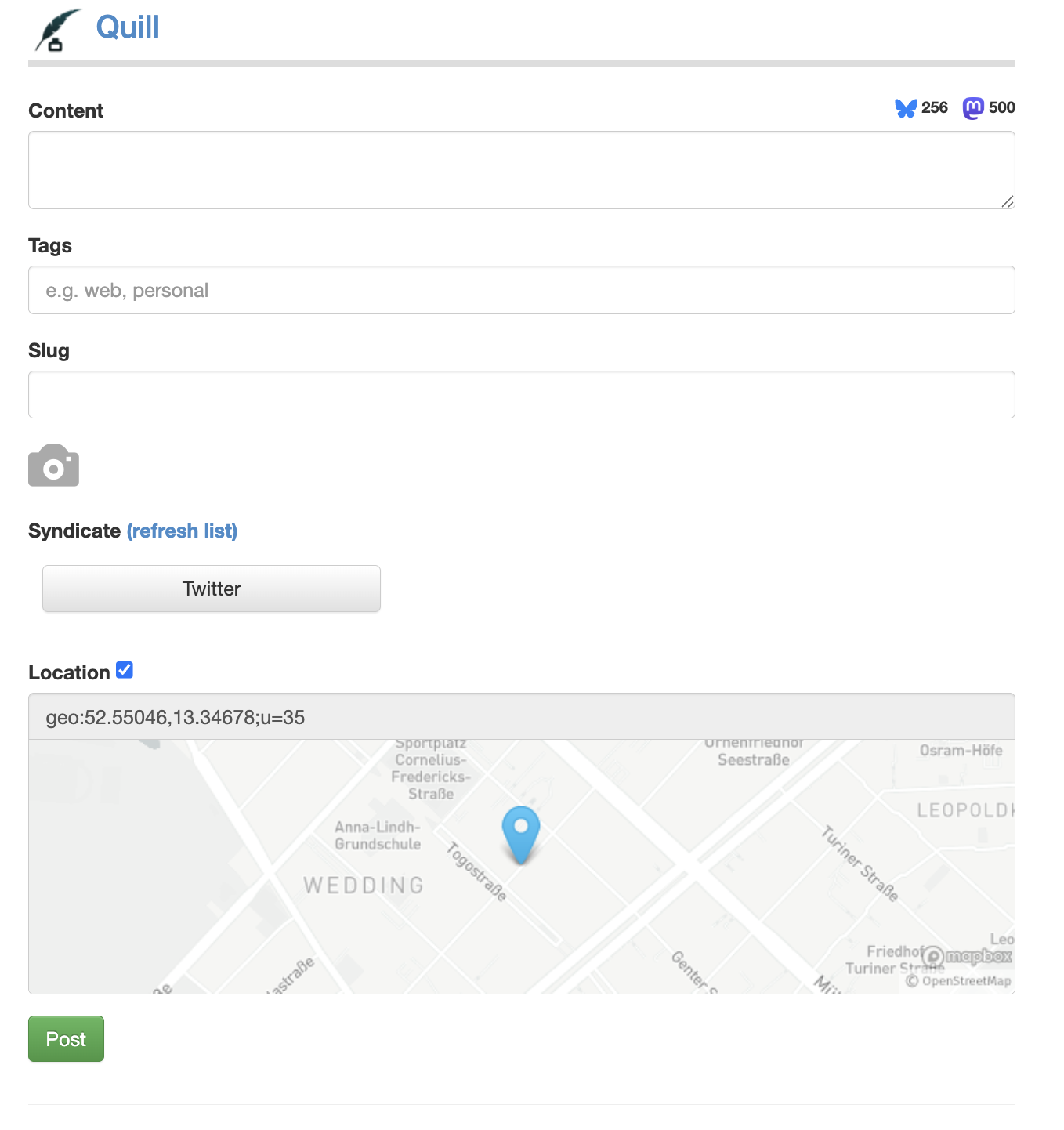 es gibt auch eine einfache möglichkeit geodaten an den beitrag zu hängen, ich kann beliebig viele fotos hochladen und optional die „syndizierung“ aktivieren, also den beitrag automatisch auf mastodon und bluesky weiterveröffentlichen (als platzhalter steht dort noch twitter, syndiziert wird aber nur zu mastodon und bluesky).