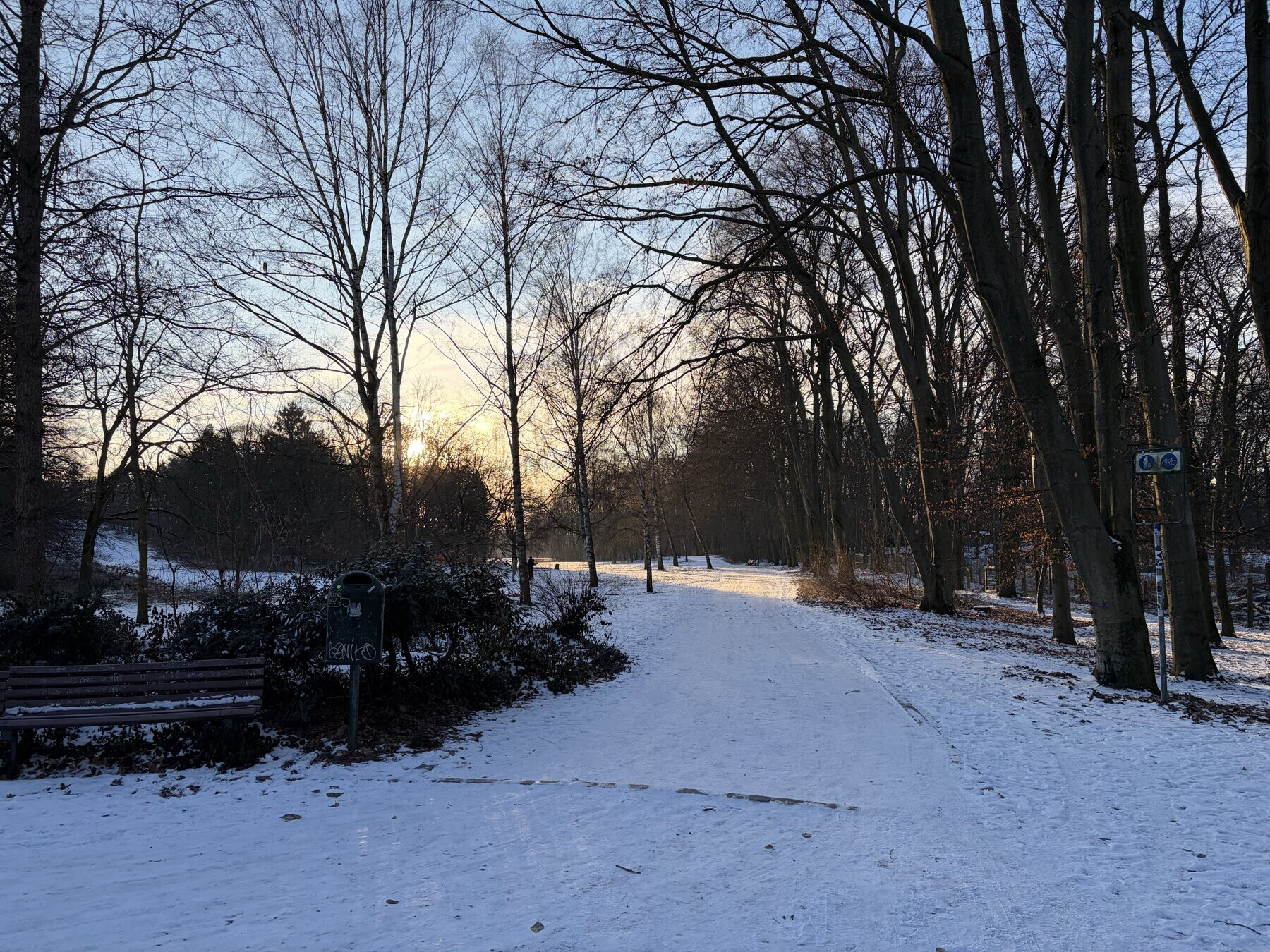 kühler, aber angenehmer morgenspaziergang mit etwas neuschnee. frida fand das alles sehr gut. mir fiel auf, wie transparent die rehberge und der goethepark im winter werden. während man im sommer ja nicht durch die bäume und büsche hindurchsehen kann, öffnen sich im winter ständig neue sichtachsen.