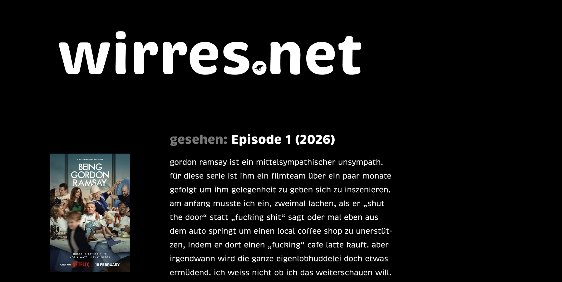 also hab ich mir die erste folge being gordon ramsay angesehen. ich vermute das wird weder so erfolgreich wie netflix chefs table oder drive to survive, auch wenn das strickmuster ähnlich ist. beim überfliegen der kritiken ist eine überschrift hängengeblieben, der ich direkt zustimmen möchte: gordon ramsay should’t be so boring.