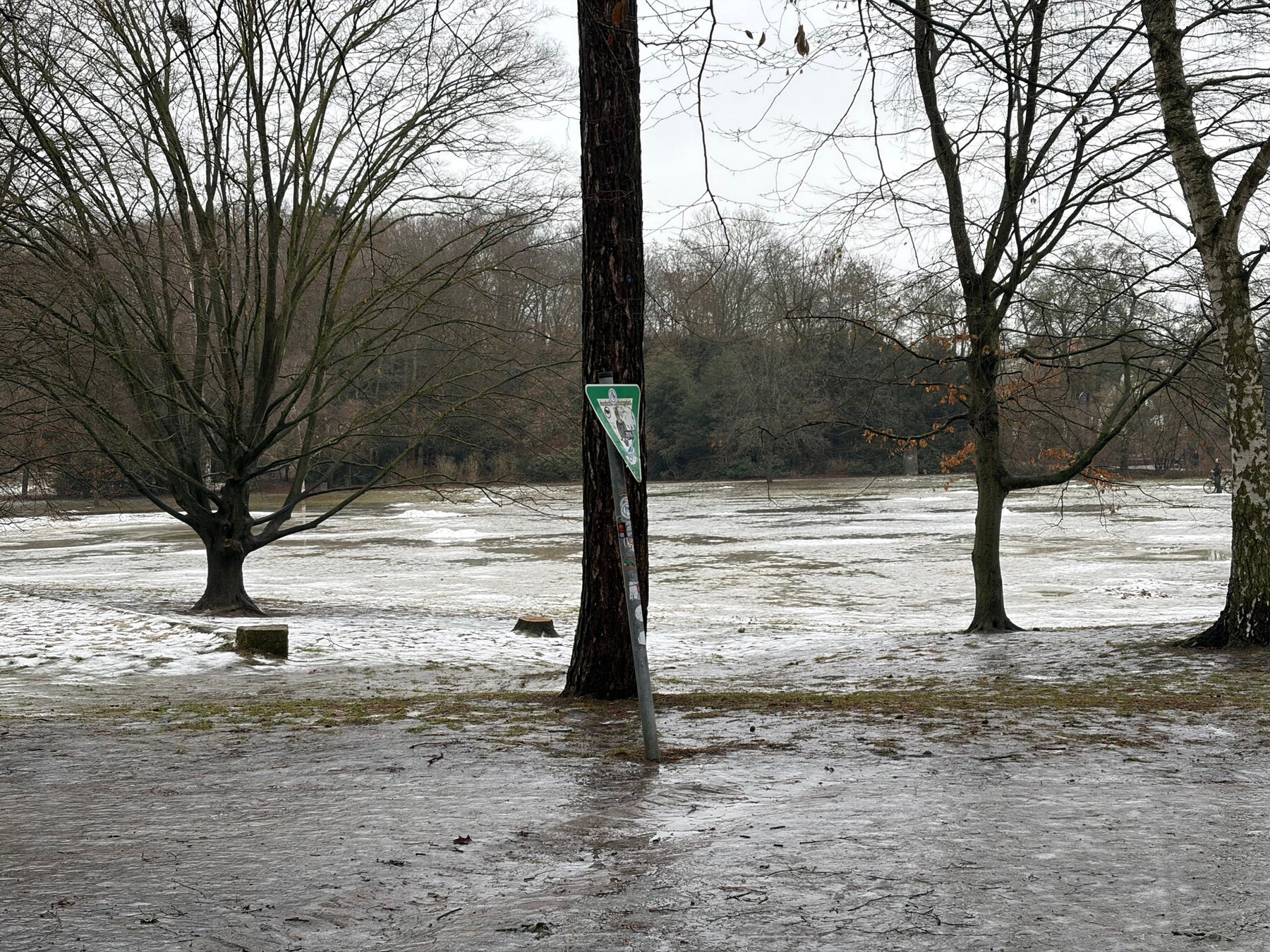 foTo vom goethepark, der schnee und das eis sind zu 70% geschmolzen, man sieht grosse pfützen und das verbliebene eis glänzt