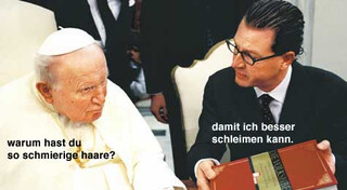 hier beruhigt einer sein schlechtes gewissen. ja, auch der mit den schmierigen haaren ist bekennender christ. auch wenn er nicht immer gutes tut.