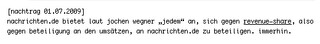 gestern machten alle möglichen newsseiten damit auf, dass nachrichten.de erlöse mit den „urhebern“ teilen wolle. es stand auf faz, turi2, meedia und was weiss ich wo. und wo stand es schon am 1.7.2009? richtig.