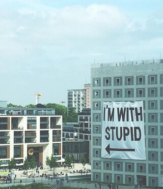 „I'm with stupid" - Banner an der Stadtbibliothek Stuttgart verspottet benachbartes Einkaufszentrum