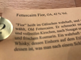 die #12 war ein fettercairn fior highland-whisky, der sowohl von whisky + cirgars, als auch whisky.de als nach kaffee-noten und schokolade schmeckend beschrieben wird. in ansätzen konnte ich das mit der zungenspitze wahrnehmen, wenn er sich im mundraum ausbreitete, blieb davon, neben dem brennen, fast nichts übrig. der fior hat keine altersangabe, dürfte also aus verschiedenen batches zusammengemischt sein, um seinen angeblich wahrhaften geschmack zu entwickeln. ich empfand den whisky eher irritierend, als wahrhaft. nicht schlecht, aber auch nicht überragend.