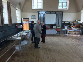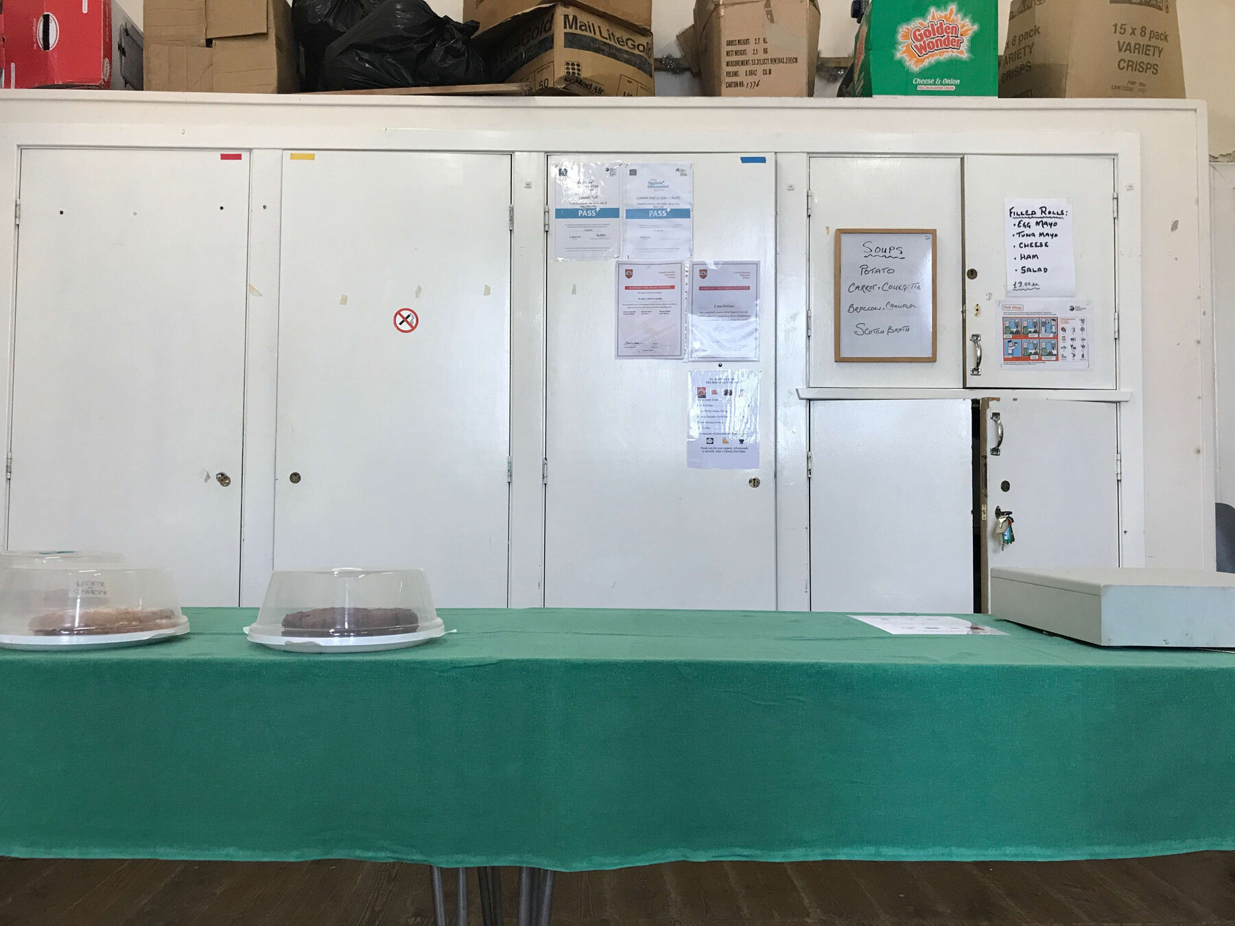 eigentlich öffne man erst um zwölf aber man mache eine ausnahme. mary weist uns den weg in eine art schrammeligen dunklen gemeindesaal in dem mehrere tische aufgestellt sind sowie eine längere tafel wo schon ein paar kuchenplatten stehen.