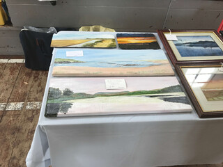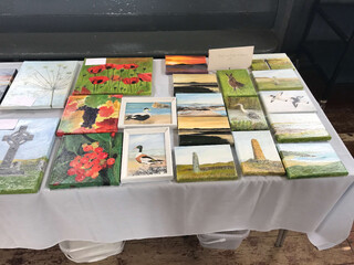 als die becher leer und bezahlt sind finden wir mary und alan im nebenraum wieder, dem ausser betrieb scheinenden kirchenschiff, einer großen leeren halle, in der ein paar tapeziertische stehen auf denen mary kleine bilder arrangiert: ihre bilder.