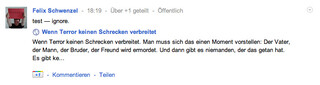 der blogeintrag von malte welding sieht in meinem google+-fluss aus als hätte ich ihn geschrieben. beim regulären sharing von links setzt google+ wenigstens noch ein favicon vor den link (hier: „Wenn Terror keinen Schrecken verbreitet“), so dass man etwas besser erkennt, dass es sich um einen link von einer anderen seite handelt.