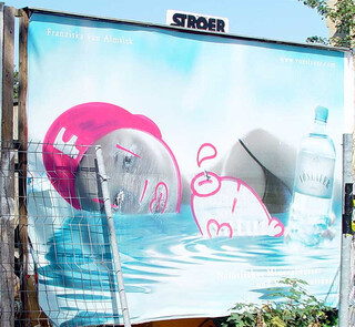 in der ´trend-metropole berlin´ wirbt franziska van almsick für vöslauer wellness mineralwasser das einem beim öffnen die augen wegschiessen kann...