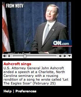 schon älter, aber nicht minder erschütternd: us-justizminister john ashcroft singt. ganz ohne humor und distanz. pathetische, selbstgestrickte, peinliche kacke.