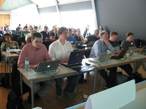 20, 30, evtentuell ein paar mehr leute sitzen in einem abgedunkelten raum. vor sich eine jeweils eine mehr oder weniger flache maschine von der ihr leben abzuhängen scheint und von der sie offenbar nur schwer ihren blick abwenden können. vorne auf einer bühne steht jemand und redet. daneben sitzen 5 leute die auch auf ihre maschinen starren.