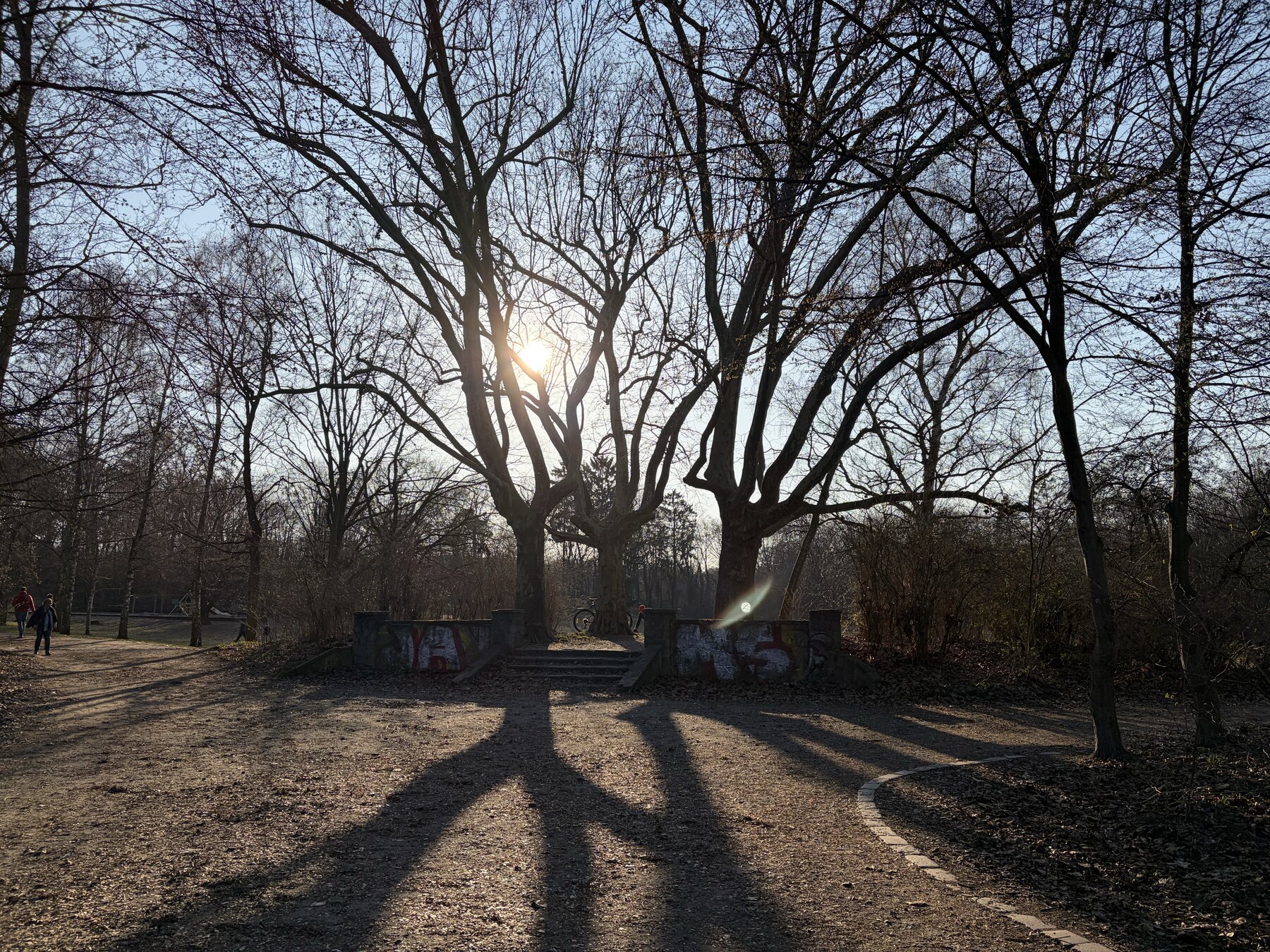alt-text: eingang des goetheparks im gegenlicht. hinter den bäumen scheint die sonne und wirft scharf geschnittene schatten auf den boden.
