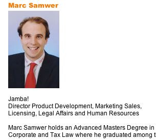Jamba! Director Product Development, Marketing Sales, Licensing, Legal Affairs and Human ResourcesMarc Samwer holds an Advanced Masters Degree in German and European Corporate and Tax Law where he graduated among the top of his class.