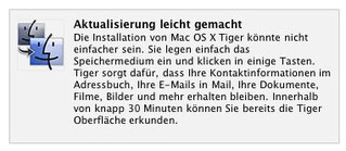 Die Installation von Mac OS X Tiger könnte nicht einfacher sein. Sie legen einfach das Speichermedium ein und klicken in einige Tasten. Tiger sorgt dafür, dass Ihre Kontaktinformationen im Adressbuch, Ihre E-Mails in Mail, Ihre Dokumente, Filme, Bilder und mehr erhalten bleiben. Innerhalb von knapp 30 Minuten können Sie bereits die Tiger Oberfläche erkunden.