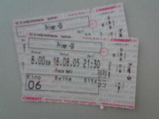 wie angekündigt, früh zwei karten für primer gekauft, für den 18.08.2005 um 2130h. hat jemand bock mitzukommen? weibliche bewerber werden bevorzugt behandelt.