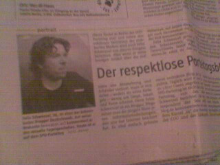 herr majica hat in der berliner zeitung auch über mich geschrieben. bei ihm stimmt ausnahmslos alles (sogar die url) ausser dass er „der“ blog schreibt. besonders gefällt mir, dass er mein substanzlosen parteitagsgeblogge ein „orthografisch mutiges Protokoll“ nennt.