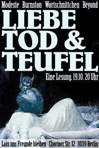 … am mittwoch, 19.10, 20 uhr, ins lass uns freunde bleiben, in berlin, in der chorinerstr. 12 (ecke zionskirchstrasse) gehen, hinsetzen und modeste, wortschnittchen, burnston und beyond lauschen. das arschloch mit der gelben wäscheklammer am revers bin ix.