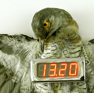ich habe vieles von meinem vater übernommen, aber nicht den wunsch vogel-leichen oder kruzifixe in meinem wohnraum zu versammeln. bis vor ein paar tagen, als ich diese kuckucksuhr von michael sans gesehen habe. seitdem kann ich mir vorstellen soetwas wie ein kruzifix oder einen ausgestopften vogel bei mir ins zimmer zu hängen. nur leisten werde ich ihn mir nicht können. nix desto trotz. falls jemand einen toten kuckuck finden sollte, ich würde mich freuen wenn er sich melden würde. dann bau ich das ding nach.