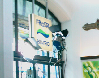 heute zickte die beifahrerin ein bisschen vor der eingangstüre. im inneren des bistros wurde gefilmt und sie schrie, als die bedienung uns zu verstehen gab, dass wir ruhig reinkommen könnten: „ich will nicht gefilmt werden.“ sie war am abend vorher mit nassen haaren eingeschlafen und ihre frisur, meinte sie, sei „unmöglich“. mit ein bisschen überredungskunst und leichtem zug am arm bekam ich sie aber trotzdem ins frosta-bistro.