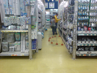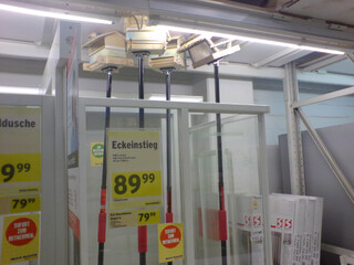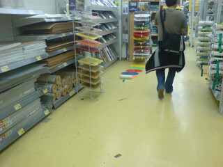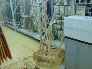 an den teppichrollen hatte der filialleiter gerade das erste ausstellungsstück weggeräumt und beklagte sich bei zwei besuchern, dass ihm irgendwer den laden „auseinanderreisse“. ein paar arragements waren aber noch zu sehen, von den baumarktmitarbeitern wurden sie allerdings grösstenteils nicht wahrgenommen. neben einem sehr hübschen pümelhalbkreis stand ein max-bahr-mitarbeiter, beriet zwei kunden und nahm die nicht dahingehörenden pümpel nicht mal ansatzweise wahr. der laden war für samstags 19 uhr ziemlich voll und für einen baumarkt waren überdurchschnittlich viele intellektuell wirkende menschen anwesend.