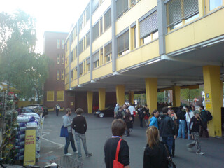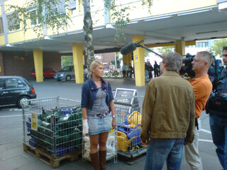 mir gefiel das unprätentiöse auftreten der installationen, draussen, auf dem parkplatz war die atmosphäre allerdings genauso prätentiös wie auf jeder anderen vernissage. wichtigtuer, angestrengt entspannt wirkende hippster, ein fernsehteam, blonde ischen, schlipsträger und kichernde, leicht überhebliche wenn-die-wüssten- oder sind-die-alle-ahnungslos-denker bevölkerten den parkplatz. fotografen fotografierten den parkplatz, die kasse und meine blauen müllsäcke.