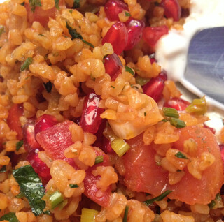 die zwiebel 5 minuten lang fettig und glasig schwitzen, danach das tomatenmark 2 minuten lang unter die zwiebelwürfel rühren. danach mit den tomatenwürfeln nochmal 4 minuten köcheln lassen. kräftig salzen, 120 ml wasser zugeben und wenns kocht, den bulgur unterrühren. ein paar sekündchen lasse ich den bulgur noch mitkochen, dann den topf von der flamme nehmen und die restlichen zutaten einrühren.