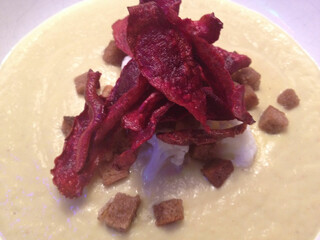 heute gabs mal wieder die grandiose blumenkohlsuppe, deren rezept anke gröner mal vor ein paar jahren verbloggt hat. dafür steht man zwar mindestens eine stunde rödelnd in der küche, aber sogar mir als blumenkohl-verachter, hat es geschmeckt. einerseits weil die suppe selbst erstaunlich würzig ist, andererseits wegen der unfassbar tollen rote beete chips. die rote beete chips mache ich übrigens mit dem sparschäler. also ich schneide eine ganze rote beete mit dem sparschäler in sehr dünne und mittelbreite streifen. so dünn lässt sich die rote beete relativ schnell fritieren.
