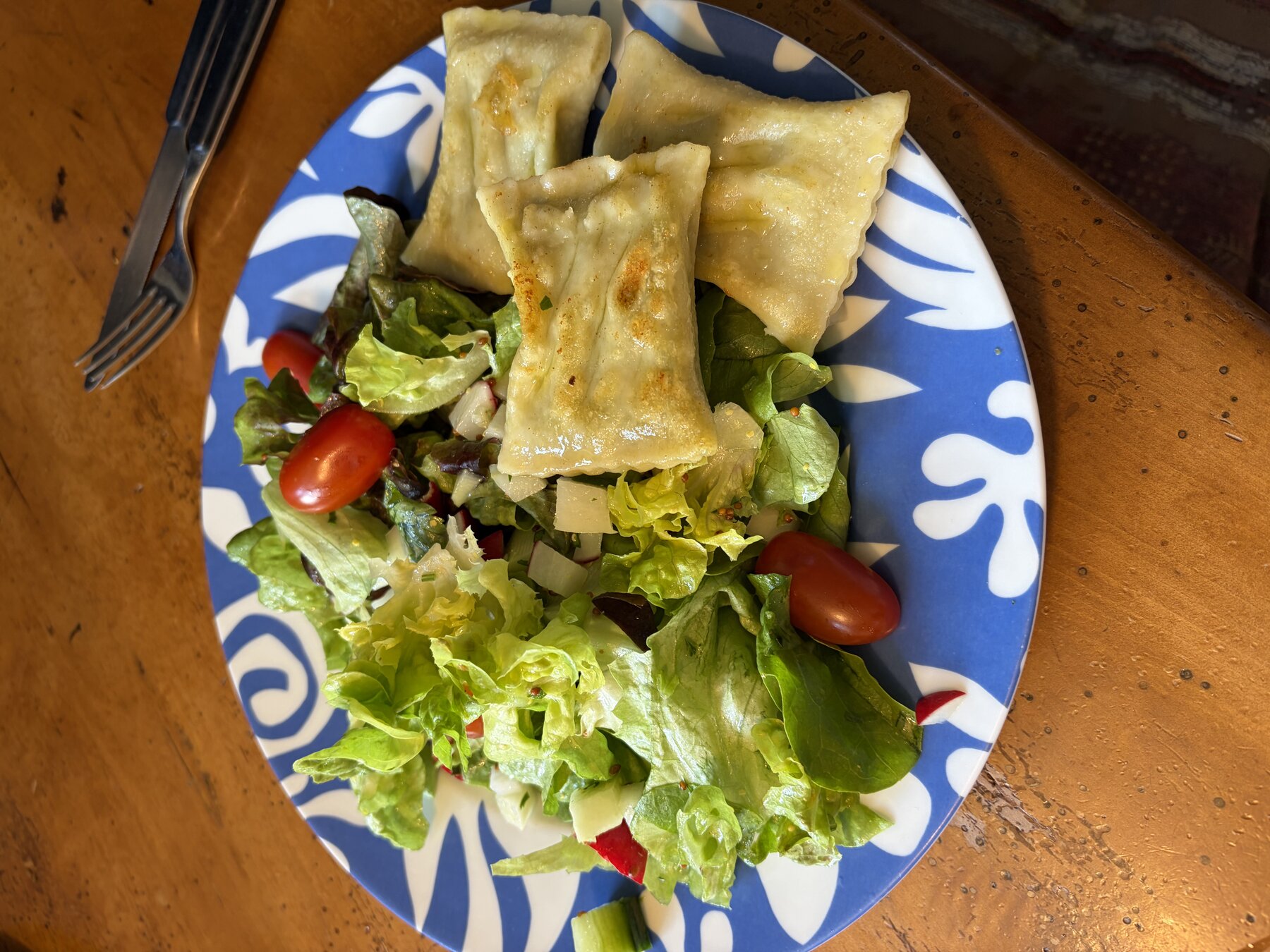 alt-text: angebratene maultaschen mit einem bunten, grünen blatsalat auf eiunem blaugemustereten teller auf einem holztisch