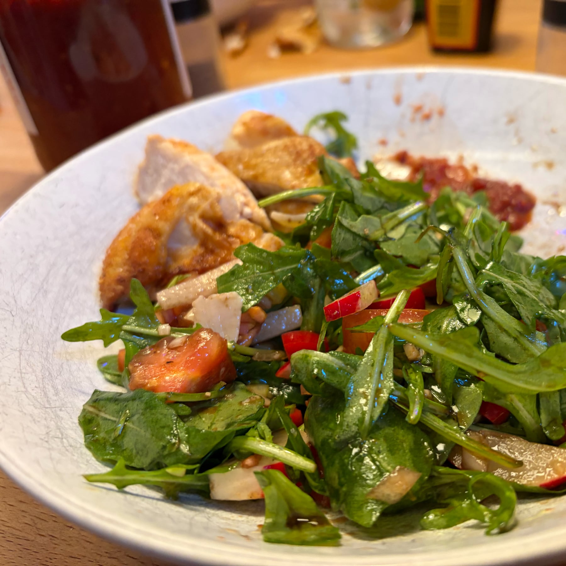 alt-text: ruccola mit gemüse und hähnchenbrust