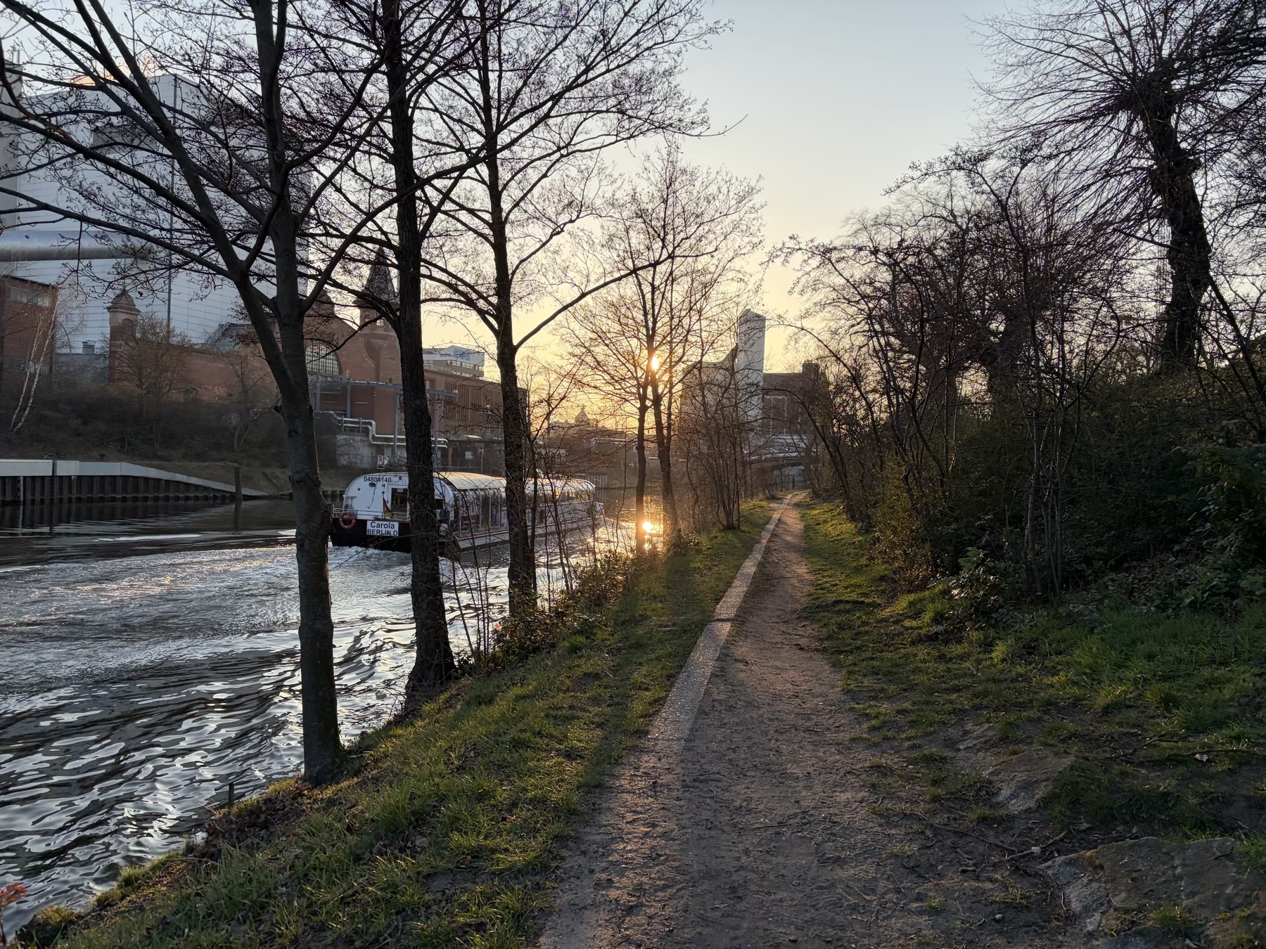 alt-text: ein trouristenschiff fährt am kraftwerk moabit und frida und mir vorbei