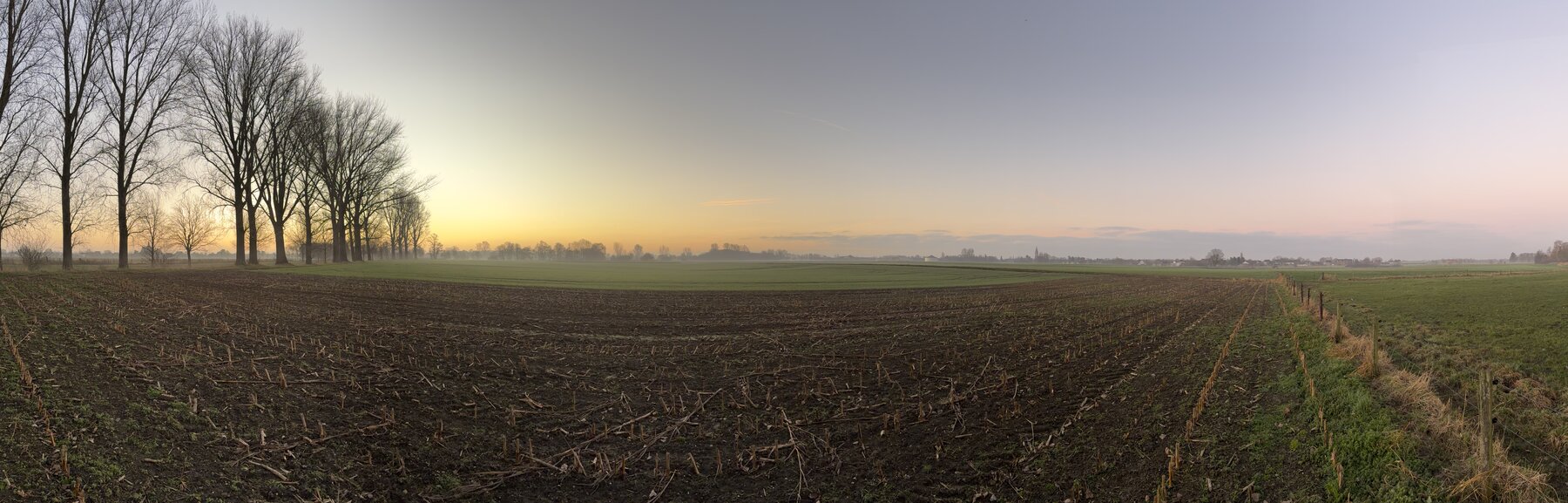 alt-text: panorama-foto von einem kahlen feld, man sieht im hintergrund kahle bäume und sehr weiten, organge-blauer himmel