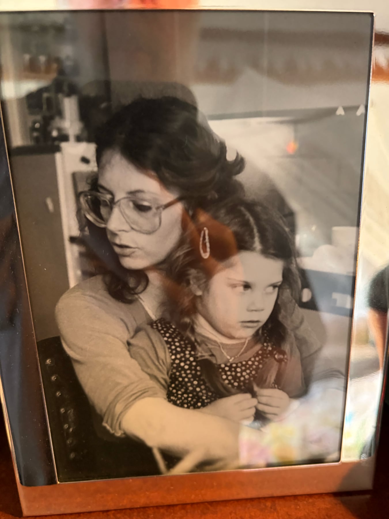 alt-text: foto eines fotos aus den achtziger jahren von meiner mutter mit meiner schwester elena auf dem schoss