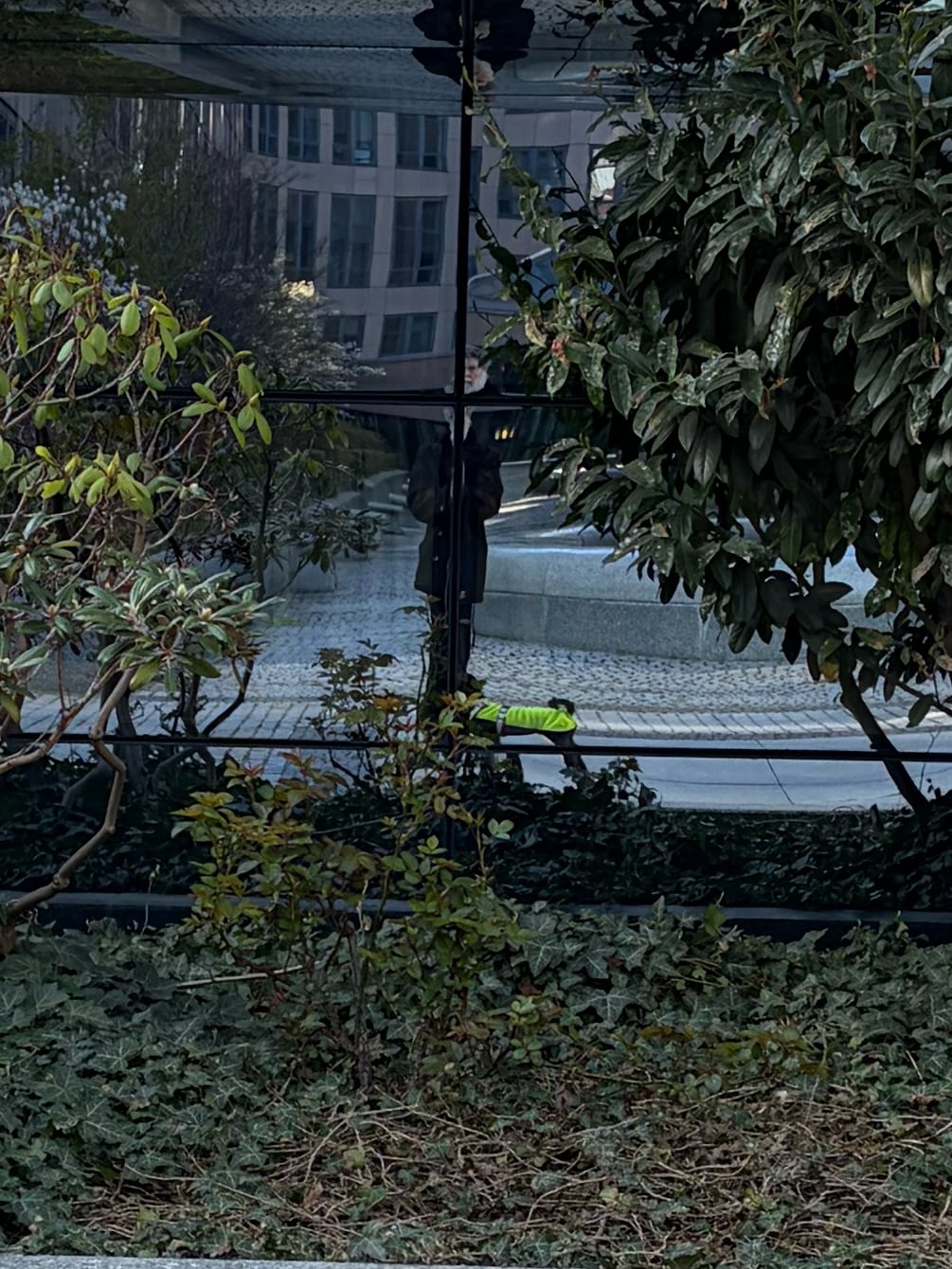 alt-text: selfie in einer glassfassade. durch die glasfassdenteile sieht man mich und frida verzerrt und abgeschnitten