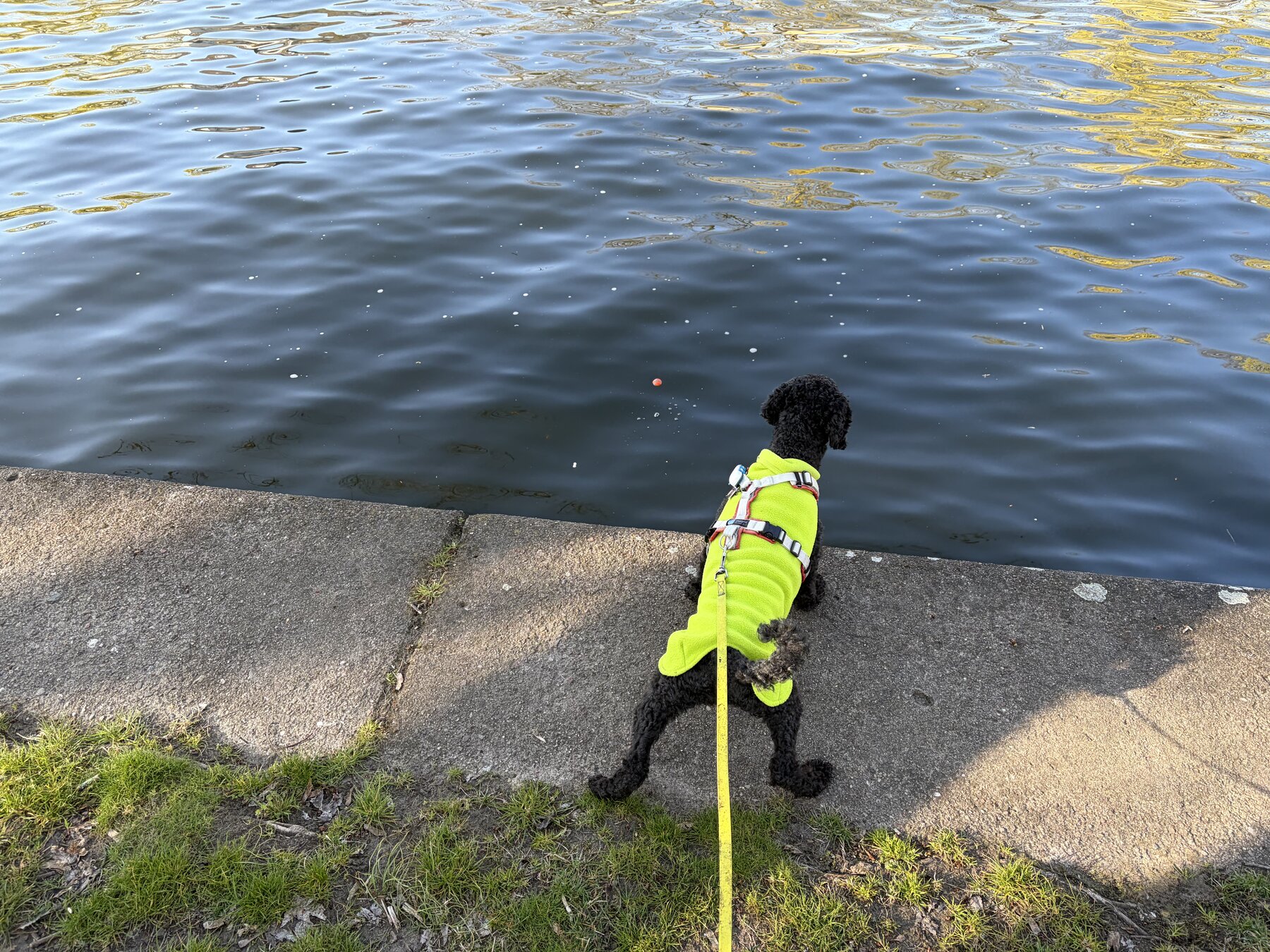 alt-text: frida blickt am rand der spree auf ihren ball, der in der spree davonschwimmt