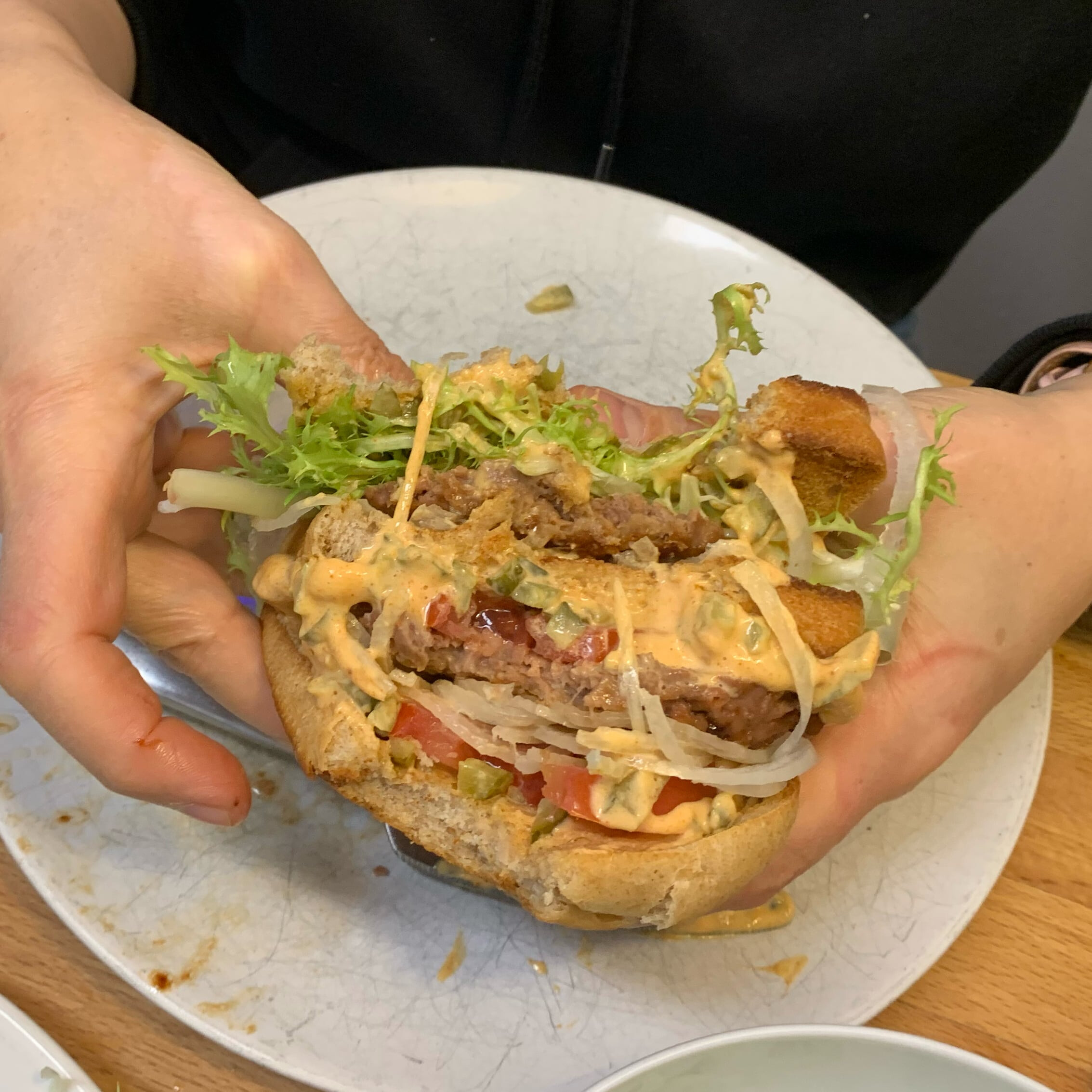 alt-text: foto eines selbstgebauten big macs mit beyond meat patties, salat, zwiebeln, tomaten und selbstgemachter big mac sauce