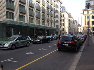 vorm regent war die strasse abgesperrt, mehrere limosinen standen abfahrbereit mit offenen türen bereit und diverse fahrer und polizisten warteten.