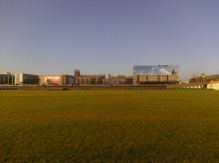 da ist die schinkelschen bauakademie-kulisse, eine ecke gemauert, der rest aus gerüsten und kunstofffolien zusammengestöpselt. die kunsthalle ist ein bemalter oder mit folien beklebter schuhkarton, immerhin findest sich in ihrem inneren mehr inhalt als taubenscheisse, müll und kies. daneben, ganz neu, eine aussichtsplattform aus gerüstteilen, die mit einer folie behängt wurde, die die schloss-fassadekulisse zeigt, die hier angeblich bald wiedererstehen soll.