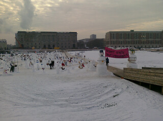 siehe auch taz „Stromanbieter tarnt Werbeaktion als Demo: Kunstschnee gegen den Klimawandel“ (via) oder hauptstadtblog.