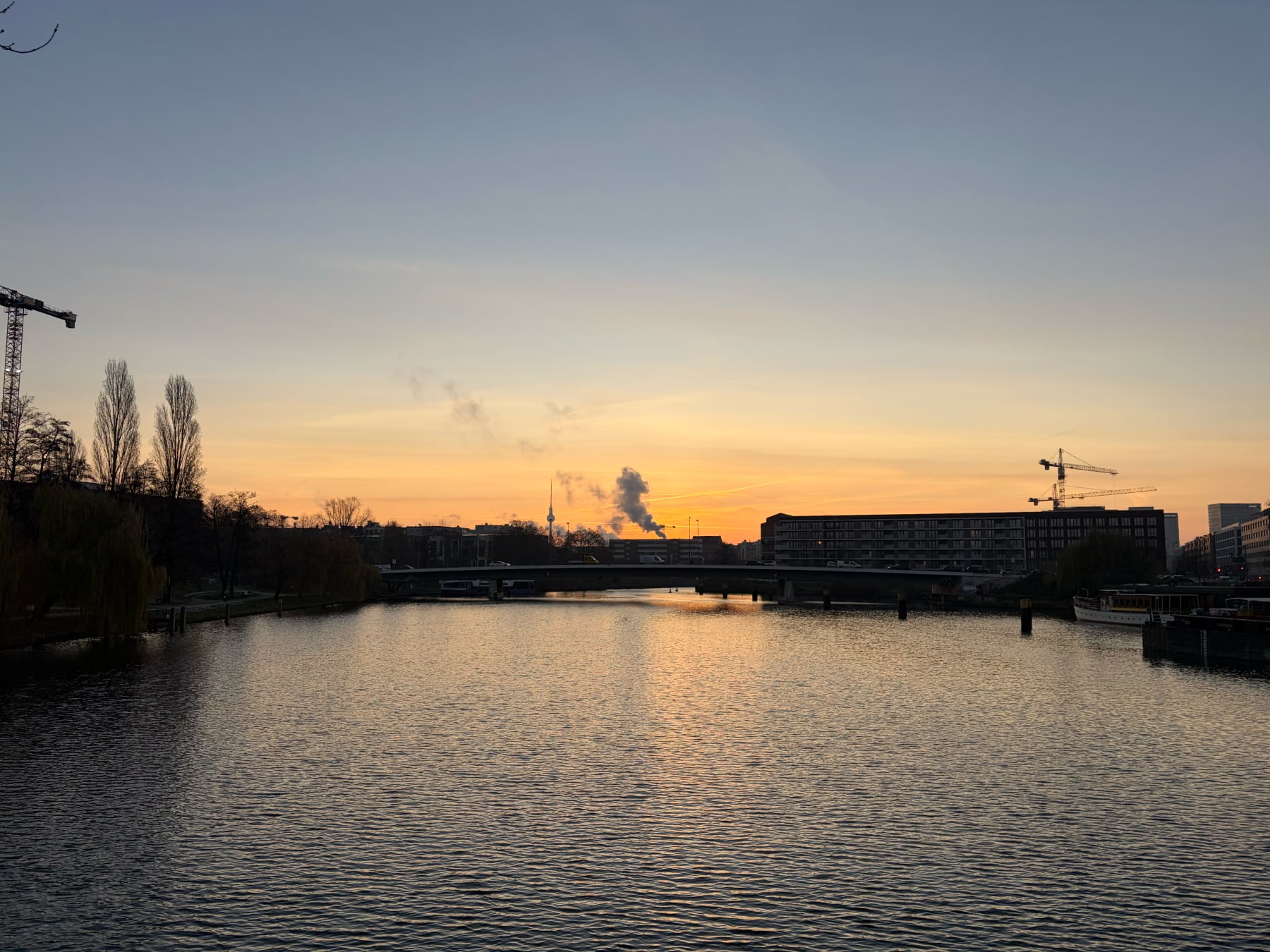 alt-text: foto vom fernsehturm und einem schornstein über den nordhafen und die nordhafenbrücke hinweg. im hintergrund geht die sonne auf.
