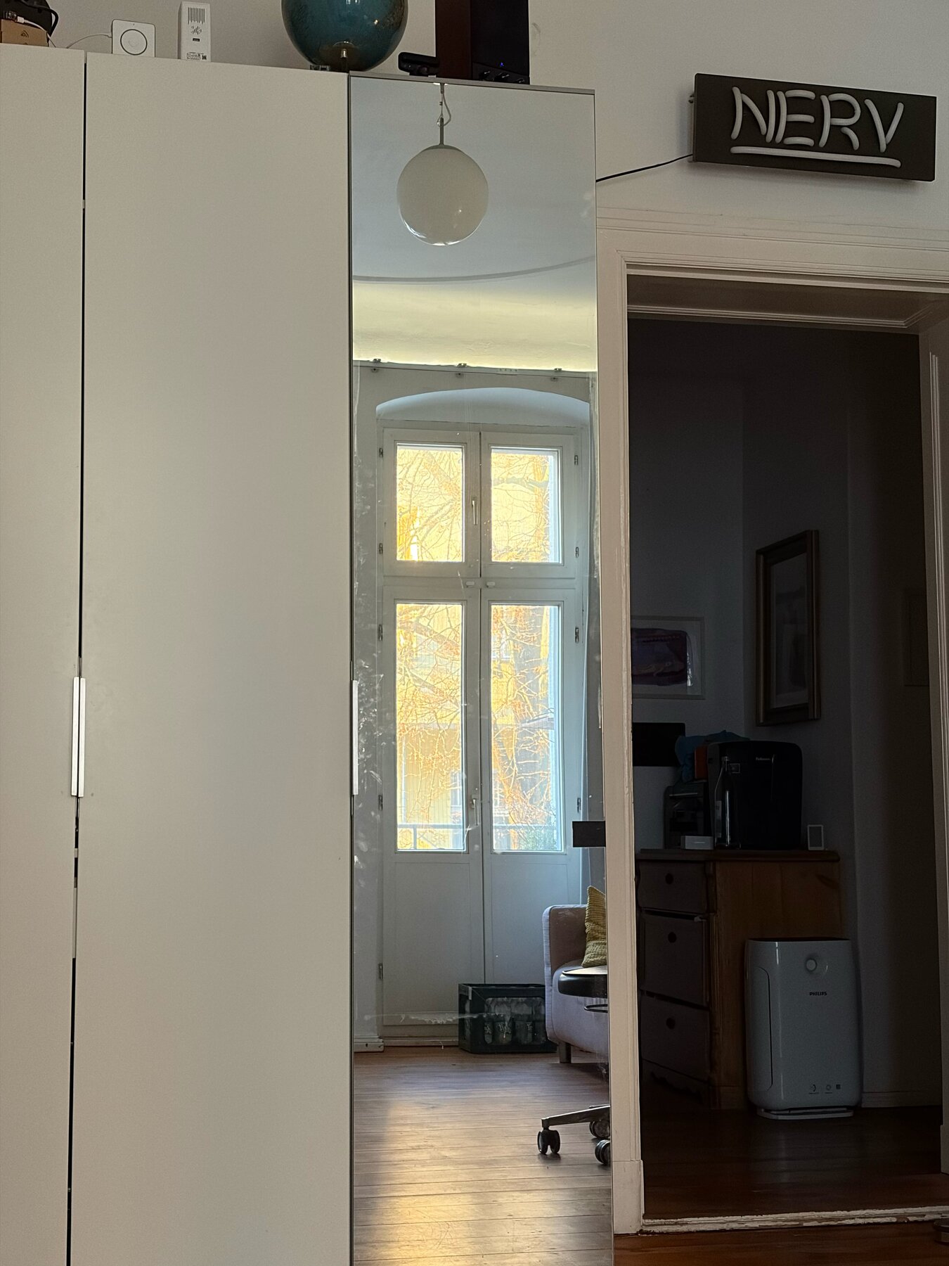 alt-text: aus dem bett aufgenommes bild meines kleiderschranks und der tür zum flur. in der spiegeltür des pax sieht man die balkontür. eigentlich sieht man noch viel mehr, das beschreibe ich aber sepaarte im artikel.