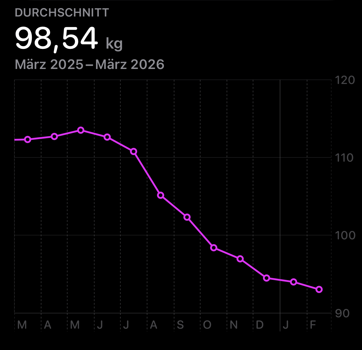 beim ø-gewicht geht’s weiter ganz leicht abwärts, auch wenn ich gefühlt im januar und februar zwischen 94 und 92 kilo feststecke. der durchschnitt sagt: es geht weiter abwärts. wohlgemerkt, ohne ozempic und ohne explizite „diät“. ich verzichte nur auf süsses und esse weniger brot, bzw. insgesamt etwas weniger.