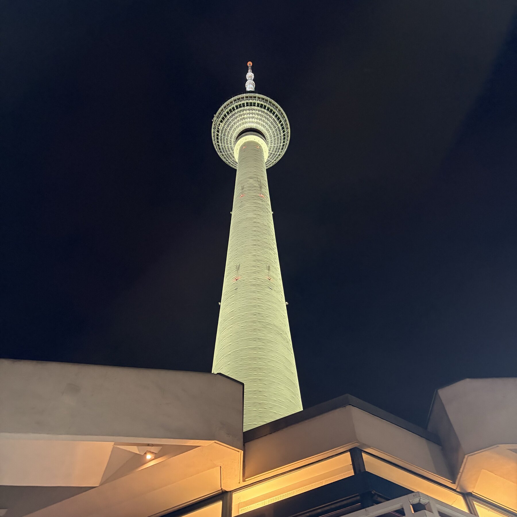 alt-text: nächtlicher blick vom eingang des fernsehturms nach oben