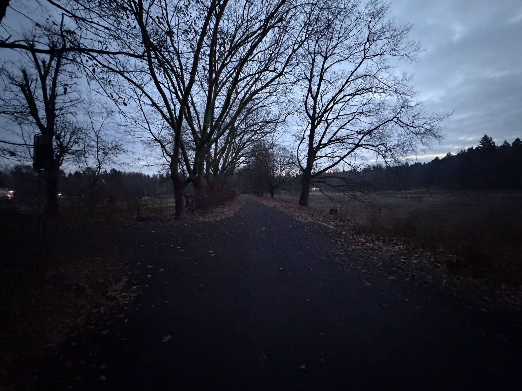 alt-text: foto von unserem frühen morgenspaziergang heute, rechts die catcherwiese, links der sportplatz. es dämmert noch.