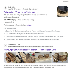 auf gewisse weise ist ein teil des experiments geglückt. dadurch dass ich rezepte auch maschinenlesbar als json-ld ausspiele, hab ich es mit meinem reproduzierten schwarzbrotrezept nach dem plötzblog auf die erste seite, in ein karussel, einer suche nach „schwarzbrot“ und „plötzblog“ geschafft. und das obwohl wirres.net google so egal ist, dass es bei einer solchen suche eigentlich noch nicht mal auf den ersten 30 seiten auftauchen würde.