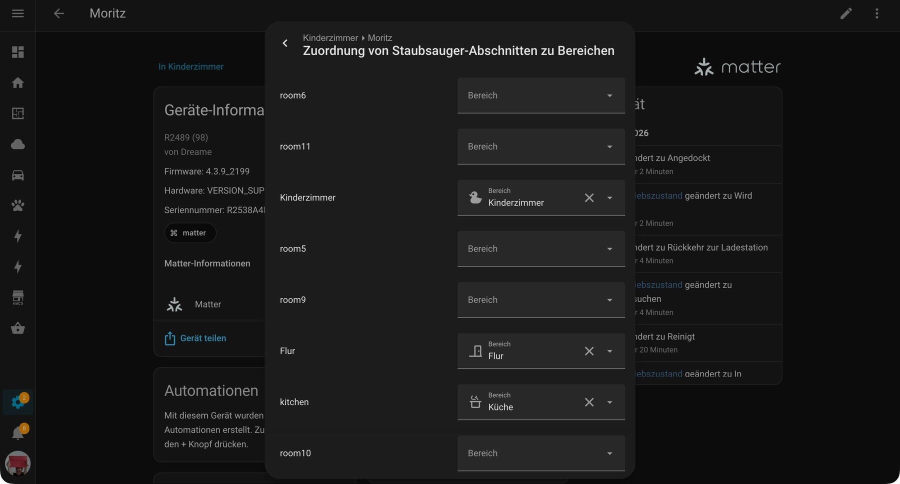 und home assistant beherrscht mittlerweile bei matter-fähigen saugern auch die raumzuordnung und sogar die reinigung einzelner räume lässt sich mit aktionen mit matter starten.