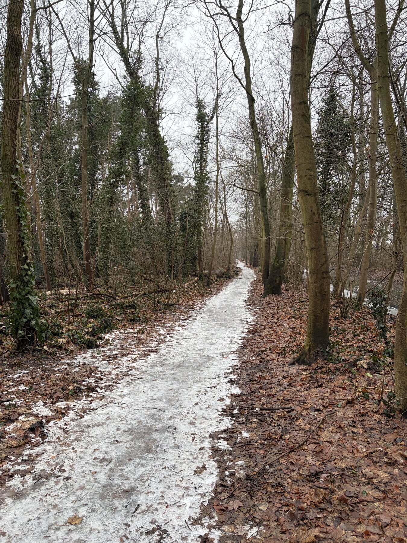 alt-text: zugefrorener weg in den rehbergen, der ein bisschen an einen gletscher erinnert.