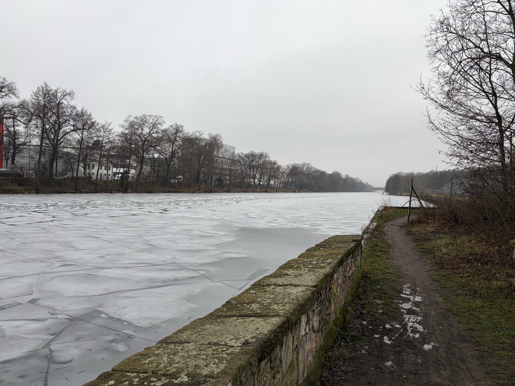 alt-text: foto vom zugefrorenem schifffahrtkanal, teilweise sind schollen abgebrochen und wieder überfroren