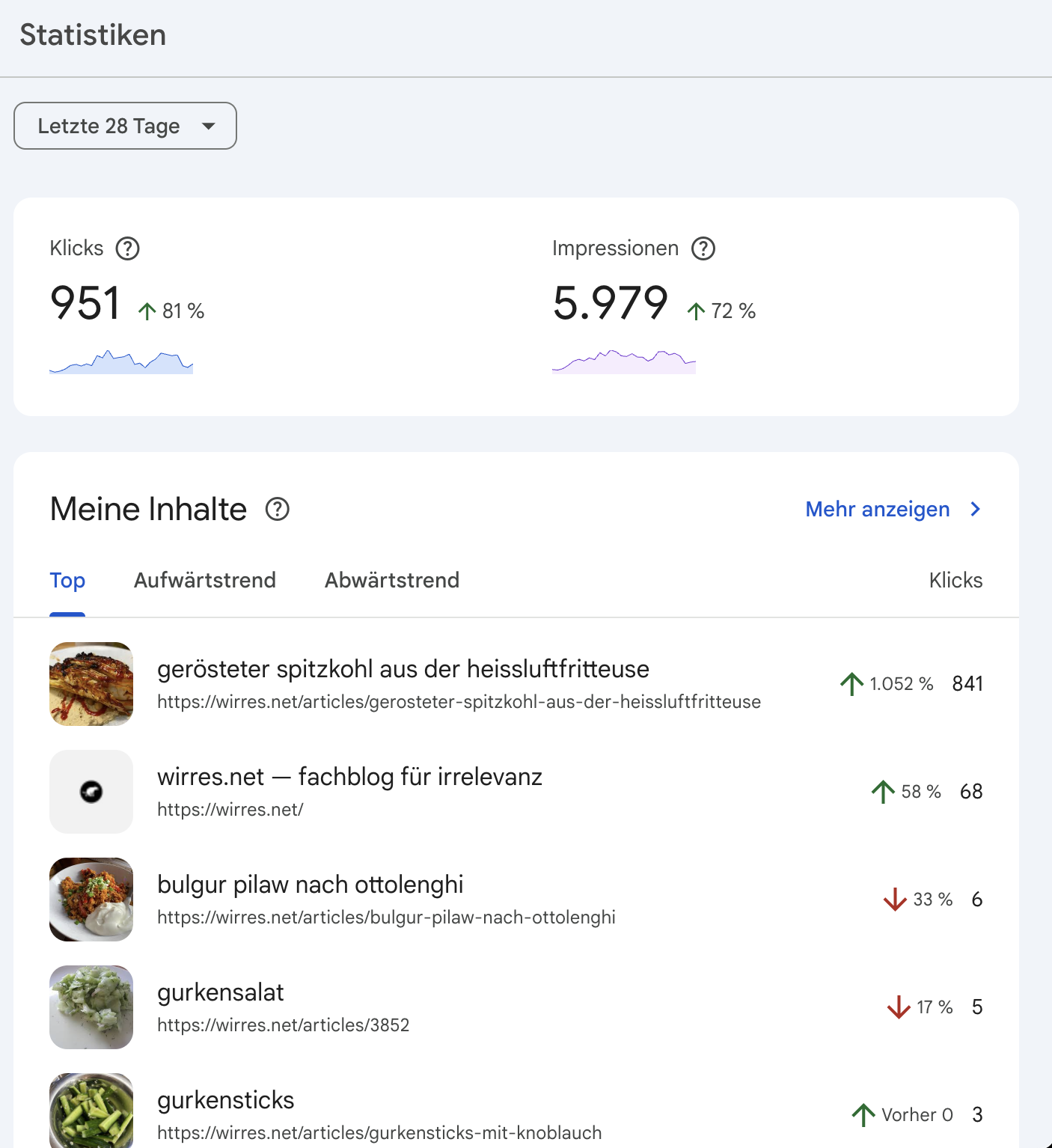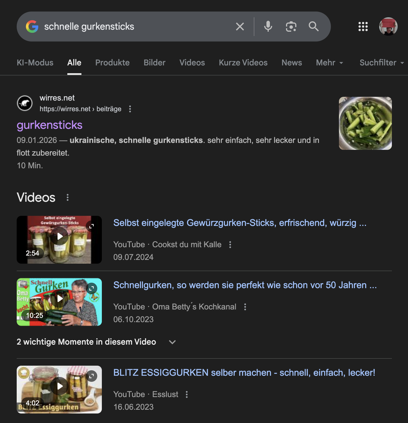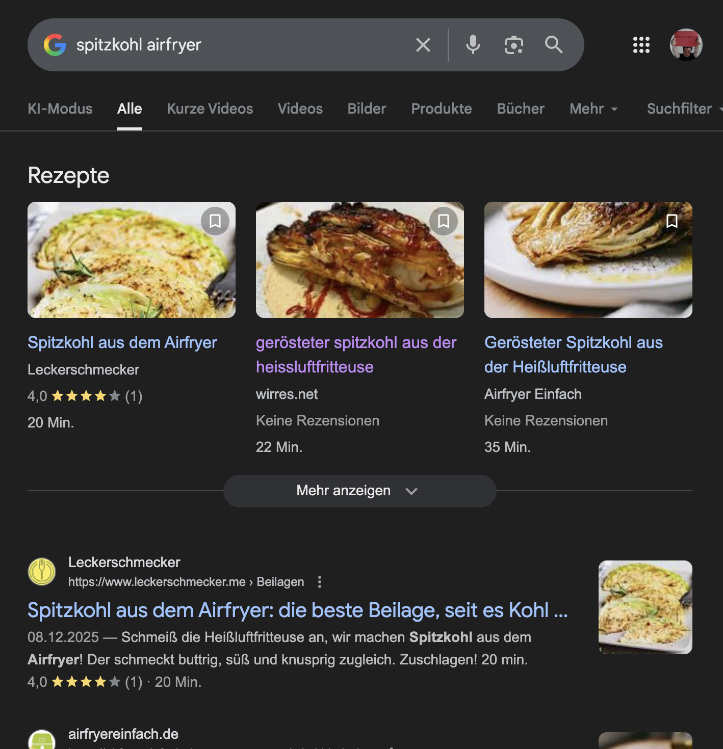 was mit json-ld allerdings super klappt ist die maschinenlesbatre auszeichnung von rezepten. so ausgezeichnete rezepte nimmt google mit kusshand und rezepte die im karussel oben in den suchergebnissen angezeigt werden sind auch der grund, warum google mir im moment so viele besucher schickt. zum ersten mal mit maschinenlesbaren rezeptdaten experimentiert hab ich vor 14 jahren. mittlerweile klappt das wirklich gut.